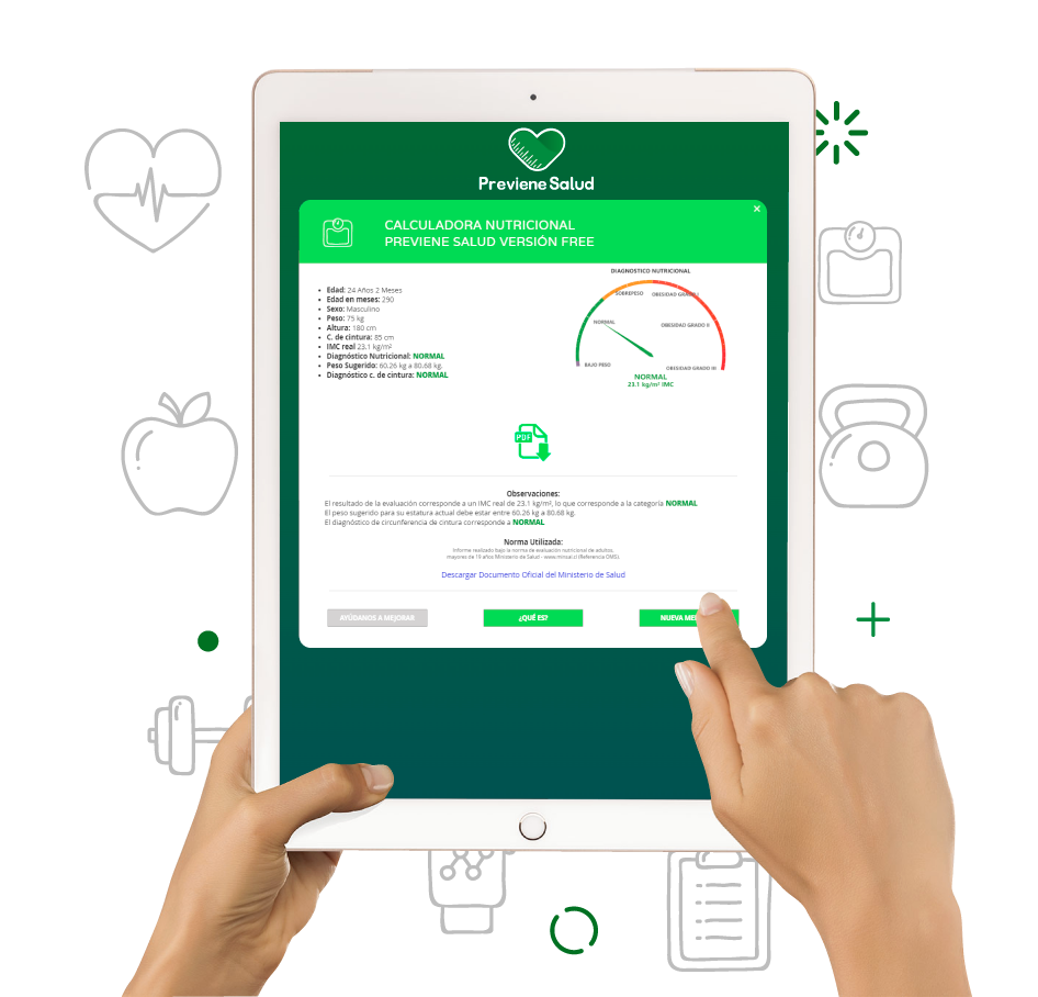 Versión gratuita de nuestra Calculadora Nutricional PrevieneSalud, para obtener de una forma simple y rápida el Diagnóstico Nutricional de niños, niñas, adolescentes y adultos, bajo los Nuevos Patrones de Crecimiento del Ministerio de Salud, y con ello facilitar el trabajo de las instituciones educativas y de salud en la identificación de grupos de riesgo para el combate del sobrepeso y obesidad. Patrones de Crecimiento para Evaluación Nutricional de 0 hasta los 19 años.