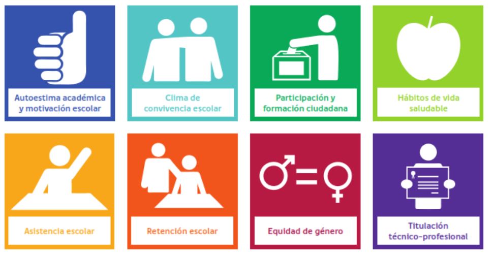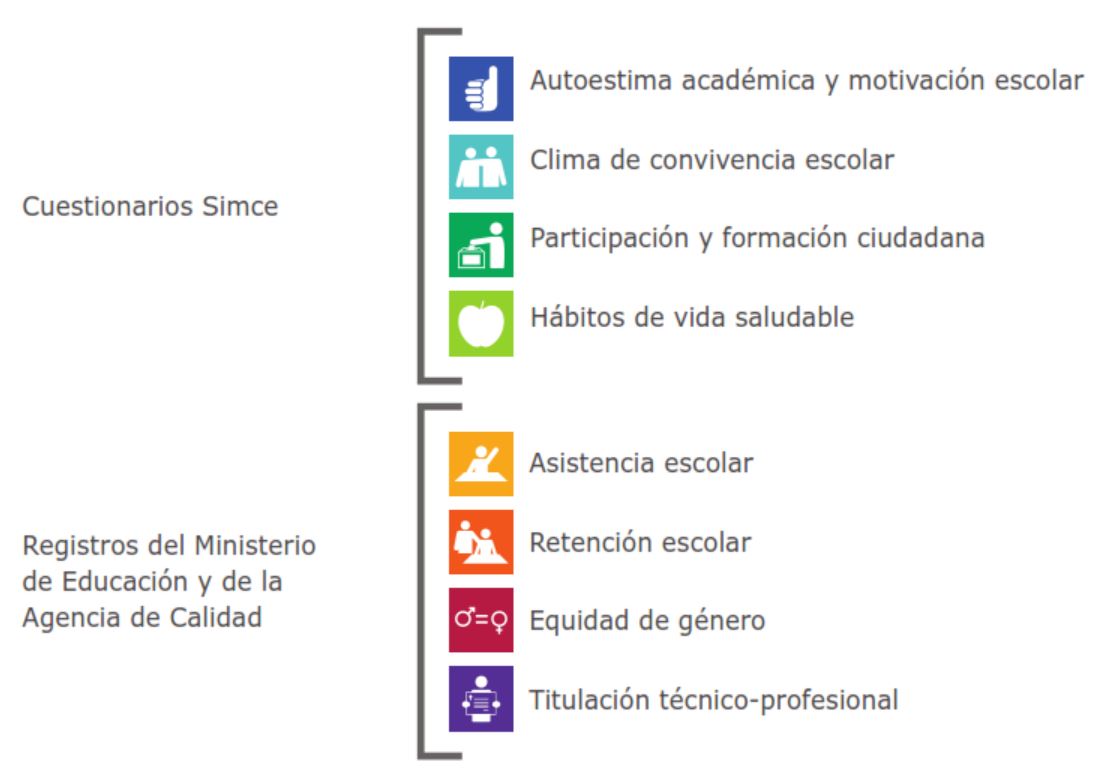 Los indicadores Autoestima académica y motivación escolar, Clima de convivencia escolar, Participación y formación ciudadana y Hábitos de vida saludable son evaluados según la información recogida de los cuestionarios Simce para estudiantes, docentes, y padres y apoderados.